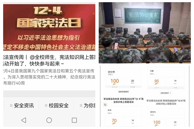 ——开展“宪法知识线上答题”活动。为了扩大宪法学习宣传工作的覆盖面和知晓率,让正能量产生大流量。学校开展了主题为“学法用法向未来的”宪法知识线上答题活动,活动开展至今已有千余人参与网上答题,通过答题活动,参与者学到了宪法知识,增强了法治观念,进一步体会到宪法这个日用而不觉的“根本大法”与个人息息相关的联系。