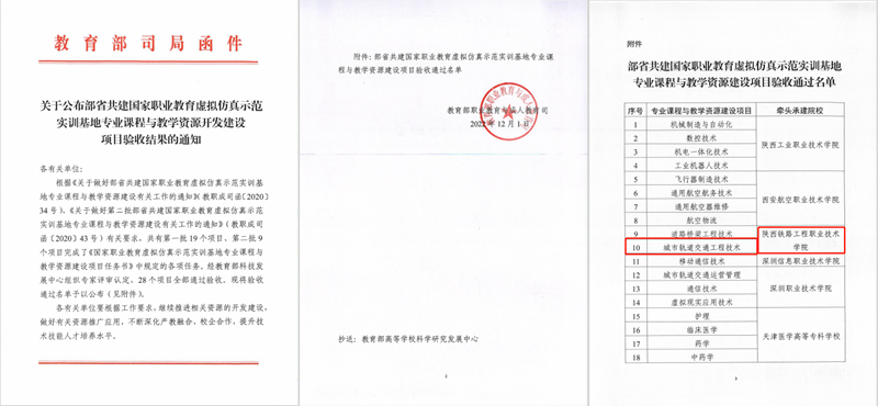 根据《关于做好部省共建国家职业教育虚拟仿真示范实训基地专业课程与教学资源建设有关工作的通知》(教职成司函〔2020〕34号)《关于做好第二批部省共建国家职业教育虚拟仿真示范实训基地专业课程与教学资源建设有关工作的通知》(教职成司函〔2020〕43号)有关要求,近日,教育部科技发展中心组织专家评审28项《国家职业教育虚拟仿真示范实训基地专业课程与教学资源建设项目任务书》。经认定,学校城轨工程学院负责的城市轨道交通工程技术专业《部省共建国家职业教育虚拟仿真示范实训基地专业课程与教学资源开发建设项目》通过教育部验收通过验收。