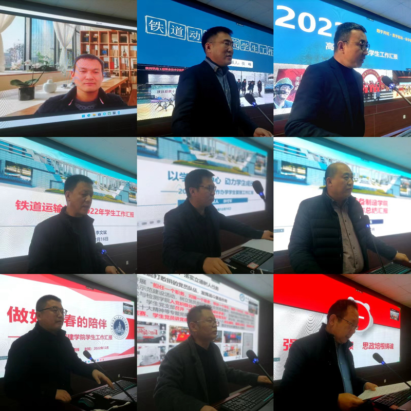 12月16日,陕铁院2022年学生工作考核汇报交流会在高新校区北三楼会议室召开,校党委书记焦胜军、副校长祝和意出席会议,学生工作部、校团委、安保处、就业指导中心等部门负责人、各二级学院党总支书记、学工办主任参加会议。会议由学生处处长曹喜龙主持。