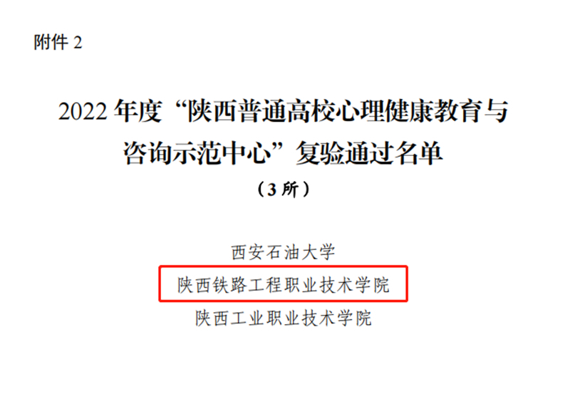 近日,中共陕西省委教育工委公布了陕西普通高校心理健康教育与咨询标准化中心验收和示范中心复验的验收结果(2022年度)。学校心理健康教育中心作为“陕西普通高校心理健康教育与咨询示范中心”顺利通过复验。