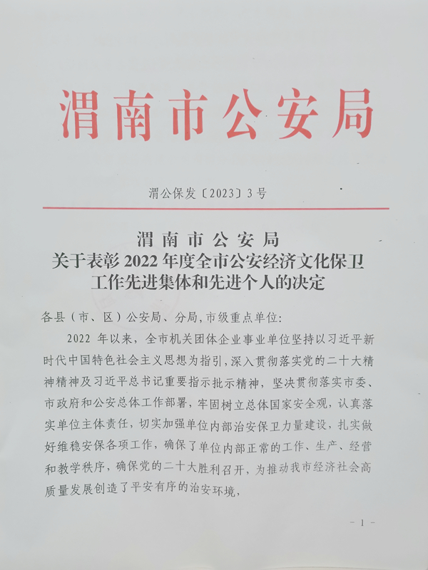 近日,渭南市公安局发布了《关于表彰2022年度全市公安经济文化保卫工作先进集体和先进个人的决定》(渭公保发〔2023〕3号),学校被渭南市公安局授予“2022年度全市经文保系统安全保卫工作先进集体”称号,是2022年度渭南市唯一获此殊荣的高校。