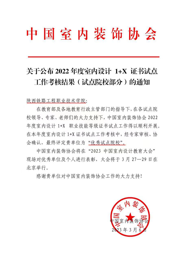 近日,在1+X室内设计职业技能等级证书考试评价组织中国室内装饰协会公布的2022年度室内设计1+X证书试点工作考核结果中,学校在1+X室内设计职业技能等级证书考培工作中表现突出,被评为2022年度室内设计1+X证书“优秀试点院校”。