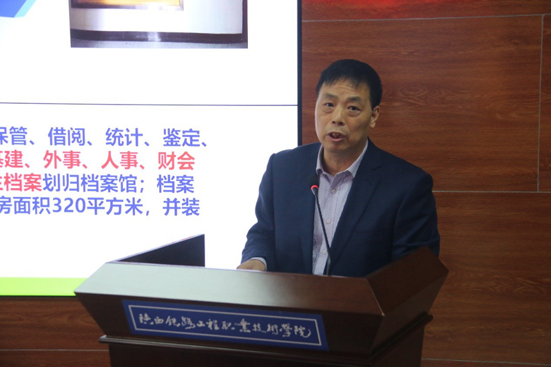 吴连书肯定了学校档案管理工作中取得的成绩,随后根据档案检查工作,对学校档案管理工作提出四点要求:一是加强学习;二是了解兰台历史;三是党要管档;四是从新修订的档案法和27号令中强调了档案信息化建设和学生类档案管理的设置;五是加强学生的档案意识;六是加强内涵建设,提升档案人员的科研和业务管理水平。