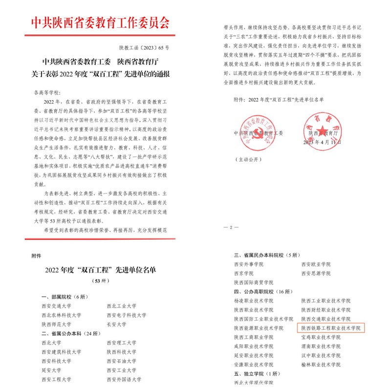 4月11日,中共陕西省委教育工委、陕西省教育厅印发了《关于表彰2022年度“双百工程”先进单位的通报》(陕教工函〔2023〕65号)文件,对全省2022年度“双百工程”先进单位进行了通报表彰。学校连续六年获得全省“双百工程”先进单位荣誉称号。全省各高等院校接受了省委教育工委、省教育厅2022年度“双百工程”工作考核,共有53所高校受到通报表彰,其中公办高职院校16所。