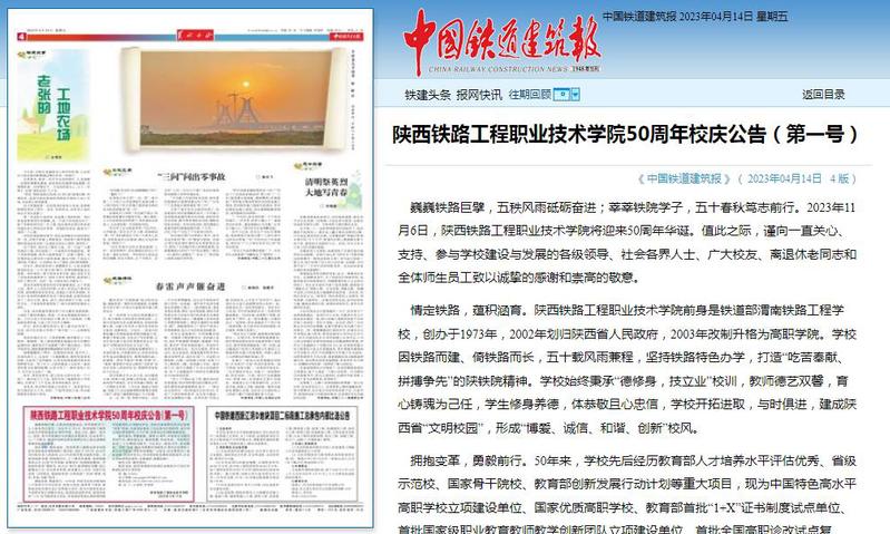 今年11月,学校将迎来建校50周年,4月14日,《中国铁道建筑报》第4版刊发了学校五十周年校庆公告(第一号),诚邀广大校友重返母校,畅叙同窗情谊,追忆求学生涯,共襄发展盛举,共创美好未来。