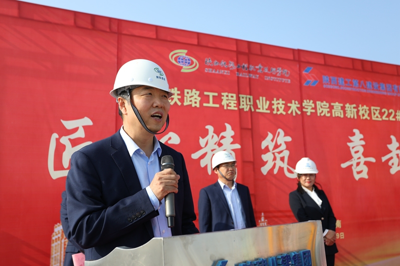 8时58分,各位领导和来宾移步主席台正中,焦胜军宣布:陕西铁路工程职业技术学院22#楼封顶浇筑现在开始。现场领导、嘉宾同执金锹,共同浇筑最后一块混凝土,22#餐饮中心荣耀封顶。标志着22#餐饮中心项目的建设迈入全新阶段。