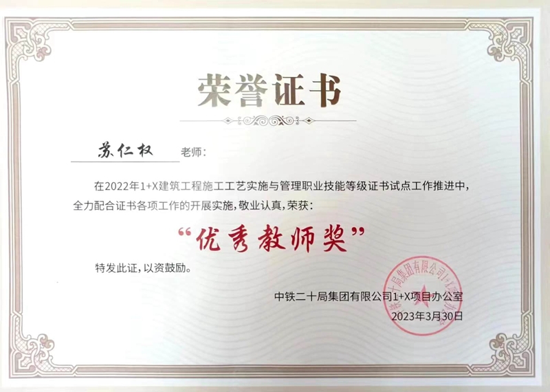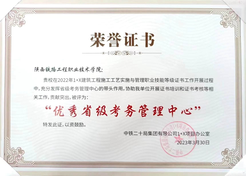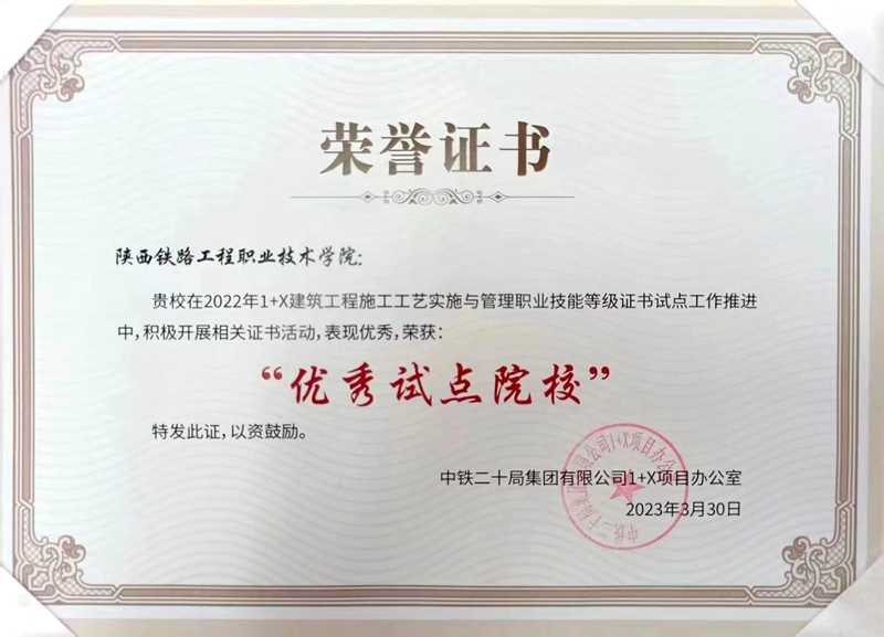 近日,中铁二十局1+X项目办公室公布2022年度建筑工程施工工艺实施与管理1+X证书试点工作考核结果,学校表现突出,被评为2022年度建筑工程施工工艺实施与管理1+X证书“优秀试点院校”“优秀省级考务管理中心”,苏仁权老师获“优秀教师奖”。