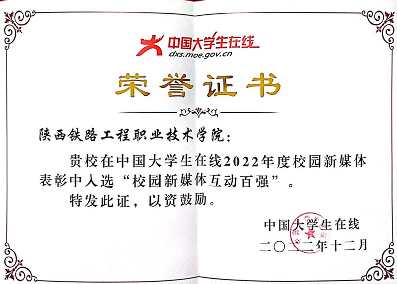 2022年12月23日,教育部中国大学生在线公布了“中国大学生在线2022年度校园新媒体表彰名单”,学校入选“校园新媒体互动百强”,全省共有13所高校入选,学校是陕西高职唯一。