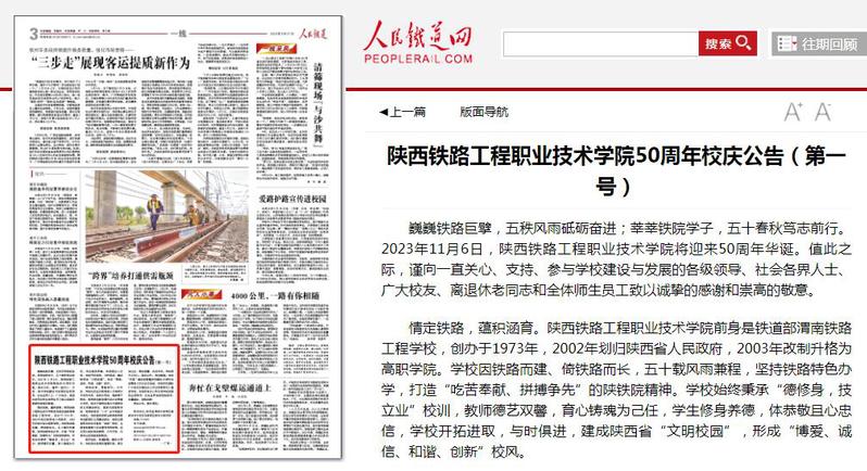 今年11月,学校将迎来建校50周年,5月27日,《人民铁道报》第3版刊发了学校五十周年校庆公告(第一号),诚邀广大校友重返母校,畅叙同窗情谊,追忆求学生涯,共襄发展盛举,共创美好未来。