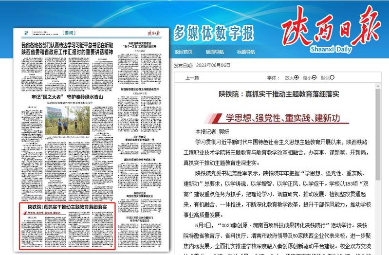 6月6日,《陕西日报》第2版要闻版报道学校将主题教育与教育教学改革相融合,办实事、谋新篇、开新局,真抓实干推动主题教育走深走实经验做法。现将全文转载如下: