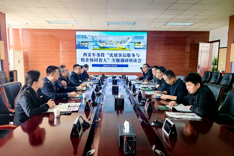 11月19日上午,西安车务段“优质客运服务与校企协同育人”专题调研座谈会在学校高新校区南三楼会议室召开。西安车务段副段长刘勇带领渭南各站负责人一行6人来校交流,学校学生处处长陈明明、副处长黄阿岗及相关科室负责人参加座谈。