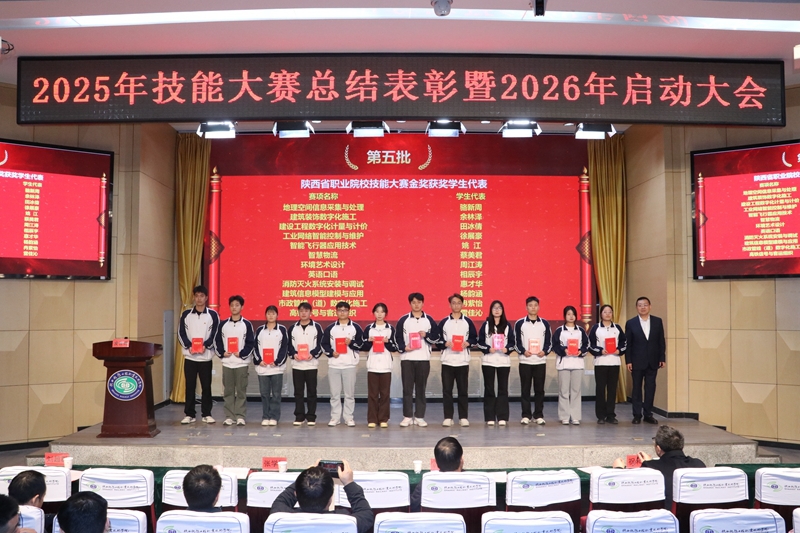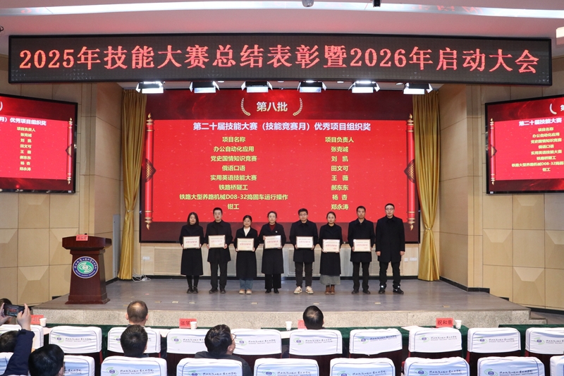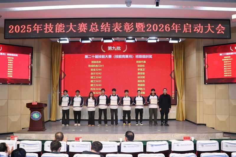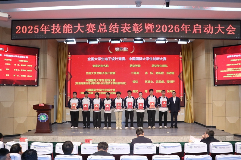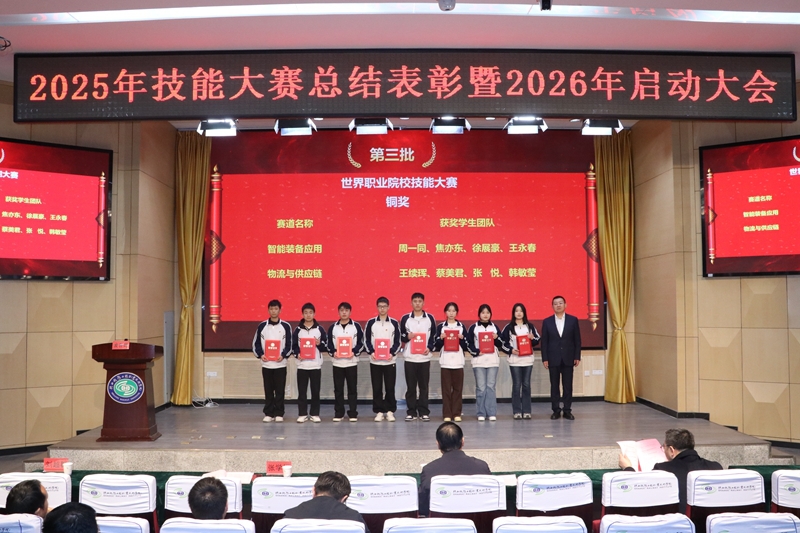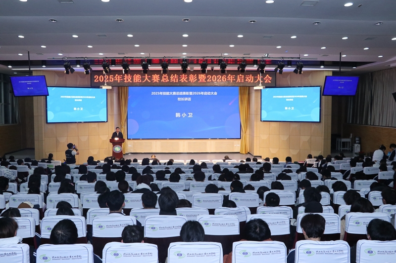 12月11日下午,学校2025 年技能大赛总结表彰大会暨2026年启动大会在高新校区博爱厅举行。大会全面总结了2025 年技能竞赛工作成效,表彰先进典型,部署2026年备赛任务,进一步凝聚全校共识,以赛促教、以赛促学、以赛促改,推动学校技能人才培养质量再上新台阶。校长韩小卫、副校长张学钢、祝和意出席大会,教务处、学生处等职能部门负责人,各二级院部负责人、实践教学管理人员,2025年世赛/省赛获奖师生代表,创新大赛获奖师生代表,第二十届技能大赛获奖集体代表,2026年备赛师生等参会,会议由教务处处长刘超群主持。