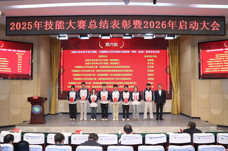 随后,祝和意宣读了《2025 年世界职业院校技能大赛获奖名单》《2025 年全国大学生电子设计竞赛获奖名单》《2025 年中国国际大学生创新大赛获奖名单》《陕西省职业院校技能大赛获奖名单》《学校第二十届技能竞赛月活动获奖名单》,全场响起阵阵热烈掌声,向所有获奖师生和集体表示祝贺。校领导韩小卫、张学钢、祝和意依次为获奖代表颁发荣誉证书和奖牌,勉励大家珍惜荣誉、戒骄戒躁,在技能成才的道路上持续精进,为学校发展增光添彩。