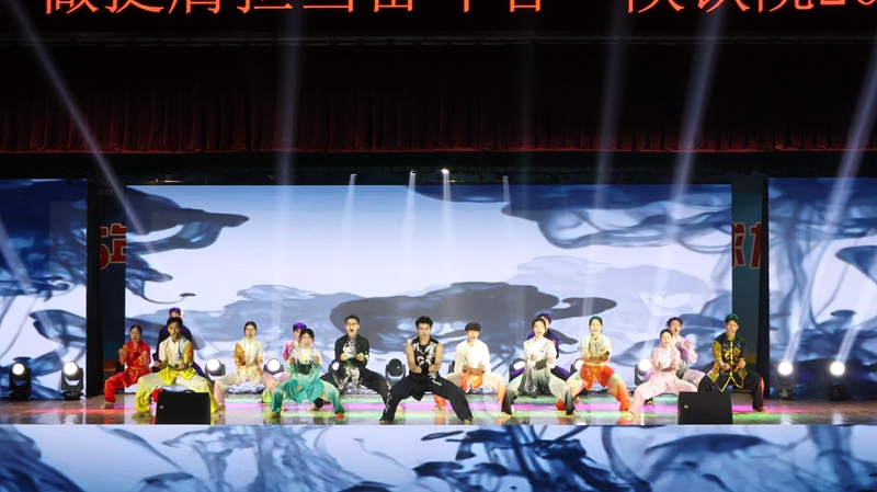 两校区晚会节目精彩纷呈,既有同源精品节目展现铁院学子同心同向的精神风貌,又有专属特色节目彰显校区独特魅力。开场舞《爱乐之城》拉开晚会帷幕,大学生艺术团舞蹈队以灵动舞步、飒爽身姿,展现铁院青年朝气蓬勃、向阳生长的青春活力,瞬间点燃全场氛围;歌伴舞《奔跑的青春》由舞蹈队与风铃合唱团联袂演绎,歌声激昂、舞姿矫健,生动诠释了铁院学子从技能实训赛场到全国竞赛舞台,从基建一线到海外实训阵地,始终以奋进之姿追逐梦想、挺膺担当的青春追求。国家级非物质文化遗产华阴老腔惊艳亮相两校区舞台,华阴市香玲老腔皮影艺术团带来《关中古歌》《将令一声震山川》,豪迈苍劲的唱腔、独具韵味的演绎,让师生近距离感受非遗文化的厚重底蕴与独特魅力,实现传统文化与青春校园的深度交融;街舞《夜芒》酷炫动感,尽显铁院学子多才多艺、敢闯敢拼的青春风采;合唱《山丹丹开花红艳艳》以深情歌声传递对党和祖国的无限热爱,彰显学校党建引领育人成效,让红色基因融入学子血脉。体育教学部武术队带来的《武魂震岳庆新程》震撼全场,队员们以刚劲招式、精湛技艺,展现中华武魂的磅礴气势,其斩获的多项全国、省级武术赛事佳绩,更是学校坚持五育并举、注重学生全面发展的生动缩影;民族歌舞联唱《爱我中华》旋律激昂、舞姿优美,师生同台演绎,抒发五十六个民族同心筑梦的家国情怀,彰显陕铁院学子扎根祖国大地、助力铁路建设的使命担当。
