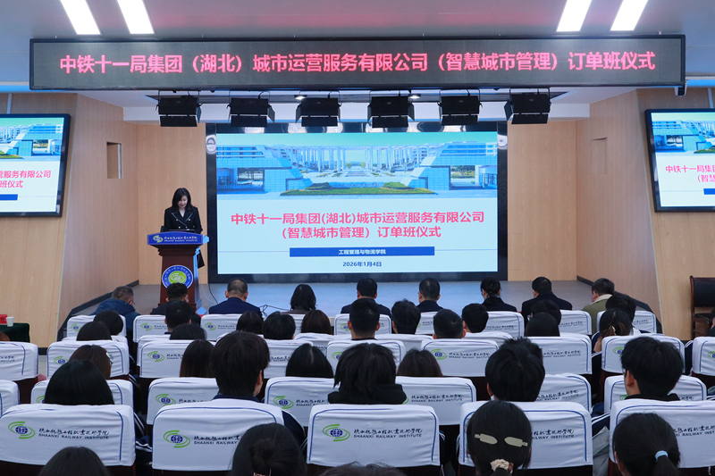 1月4日下午,学校与中铁十一局集团城市运营服务有限公司(智慧城市管理订单班)开班仪式在高新校区举行。学校校长韩小卫、副校长张学钢、教务处处长刘超群、校企合作处副处长苏昭,工程管理与物流学院院长叶超、党总支书记张玉鹏,中铁十一局城运公司党委书记诸葛祥菊、党委副书记兼工会主席及纪委书记陈安伍等一行4人出席仪式。仪式由工程管理与物流学院副院长杨小玉主持。