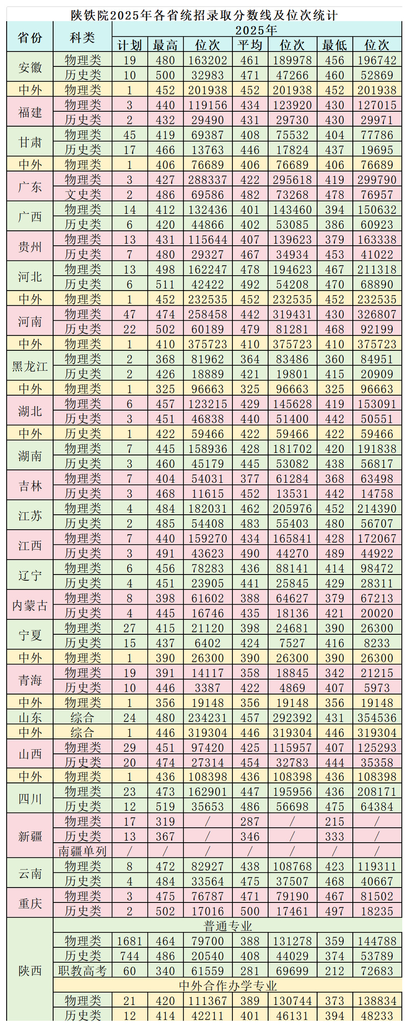 2025年陕铁院各省录取分数线