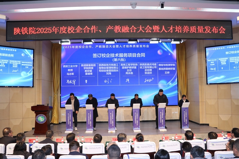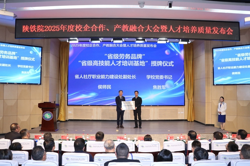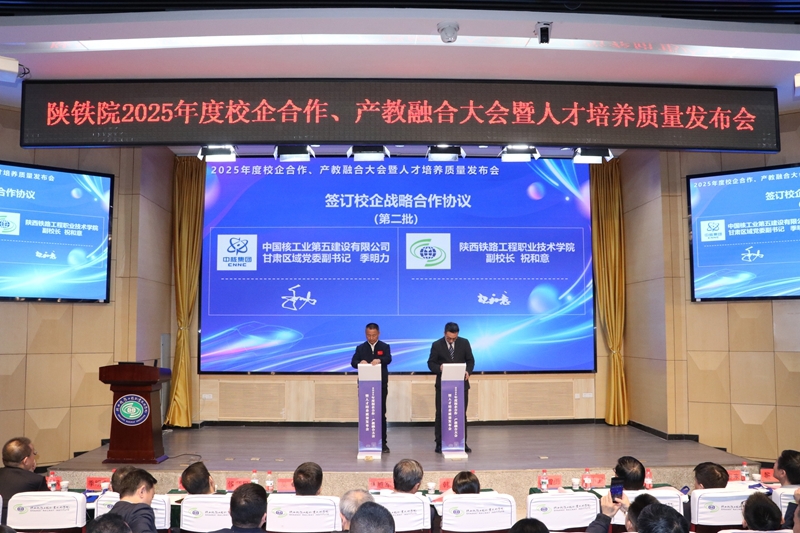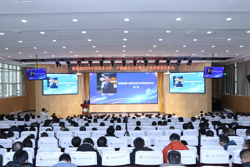 1月13日下午,学校在高新校区博爱厅举行2025年度校企合作、产教融合大会暨人才培养质量发布会。会议以“校企携手育英才 产教融合创未来”为主题,旨在总结办学成果、研判发展形势、深化多方合作,共同推动职业教育高质量发展。陕西省教育厅、陕西省人社厅、渭南市人民政府相关部门领导,中国铁路兰州局集团有限公司、中铁一局集团有限公司等80余家合作企业代表,省内外中学校长、家长代表、媒体记者及学校师生代表等500余人参加会议。学校党委副书记李林军主持大会。