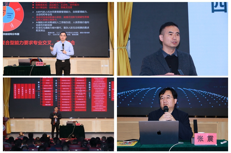 此次培训聚焦职业教育发展前沿与教职工能力提升需求,邀请四位行业专家带来精彩报告,内容兼具理论高度与实践指导意义。中国物流与采购联合会教育培训中心主任李俊峰,结合职业教育发展趋势,以“AI+职业教育”为核心,深入探讨人工智能技术与职业教育专业建设、课程改革、实训教学的融合路径,为学校推进“AI+专业”建设提供了清晰思路;全国教书育人楷模、西藏职业技术学院教师张艾平,通过自身教育经历与感人故事,生动诠释“老西藏精神”中坚守奉献、扎根教育的育人价值,引发教职工对师德师风建设与教育初心的深刻思考;北京网梯科技发展有限公司总裁张震,立足教育数字化转型背景,系统剖析人工智能的发展和人工智能在教育教学场景中的应用实践,为教职工展示了人工智能驱动教育转型的具体路径;360亿方云高级讲师刘继权,则聚焦大模型与智能技术的实际操作应用,通过案例演示、实操讲解,帮助教职工掌握大模型智能体在教学、科研、行政管理等工作中的使用方法,切实提升教职工运用智能技术的能力。四位专家的报告层层递进、各有侧重,为全体教职工带来一场兼具知识厚度与实践价值的“知识盛宴”,引发热烈反响与深度思考。
