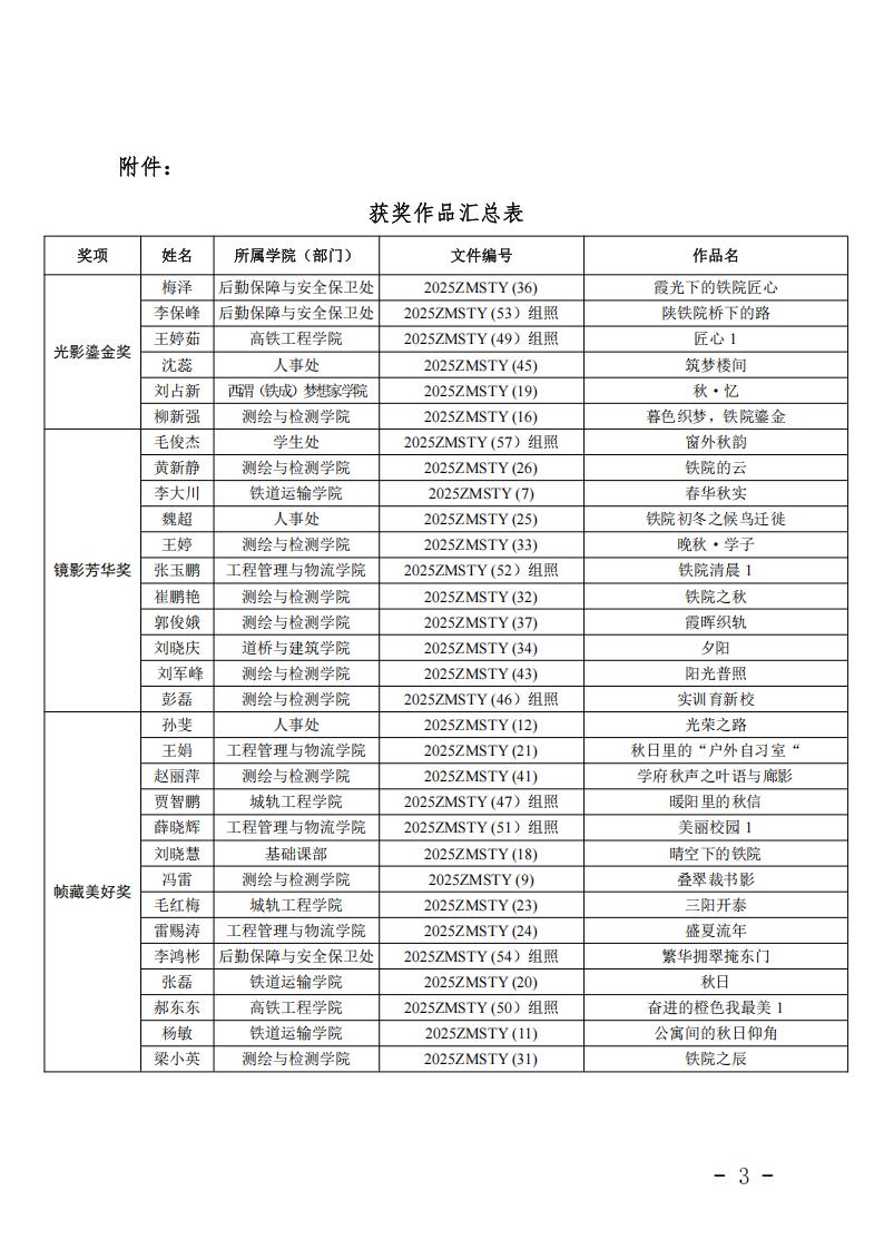 为丰富教职工精神文化生活,展现校园风貌与教职工积极向上的精神状态,由党委宣传部、校工会联合举办的第九届“最美陕铁院”手机摄影大赛圆满收官。本次大赛自启动以来,得到全校教职工积极响应,共征集到57幅紧扣校园风景、自然景观、校园活动等主题的优秀摄影作品,用镜头定格校园美好瞬间,以光影传递铁院温度。经专家评审,大赛最终评选出获奖作品31幅,其中光影鎏金奖6幅、镜影芳华奖11幅、帧藏美好奖14幅。获奖作品视角多元、立意鲜明,既有霞光映照下的校园建筑,也有四季更迭中的自然景致,更有充满活力的校园场景,生动展现了陕铁院的环境之美、人文之美、奋进之美。